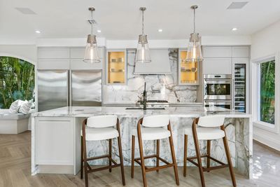French Contemporary Estate. 100% redone on a builder acre hidden in Gated Palms Estates on cuI de-sac. Uniquely convenient & private. MOVE IN READY! NO HIDDEN COSTS. Generator pwr.6,800 sqft, 24 foot vaulted ceilings, 3 seating areas. 5 bed/5 ensuite baths & staff quarter. Scavolini gourmet kitchen, herringbone floors, Subzero fridge/freezers, Gagganeau wine fridge & Wolf gas cooktop. Grand master with private lounge ,3 large walk-in closets & private exit to pool & garden. Great room, formal dining & living, family room. Entertainer's dream, impact glass, large outdoor entertainment. 500 ft covered terrace, lounge area & marble deck. Outdoor kitchen, vast garden lined with Palms. Perfect for exclusive events. French lamp lite tree-lined private manicured access. Near top schools, restaurants & shops .